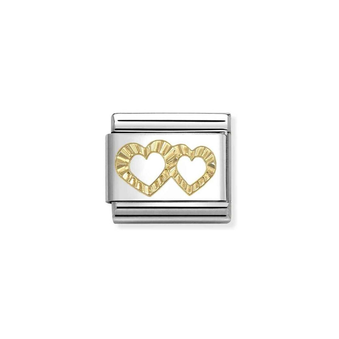 Charms Nomination Italy Composable Symboles en acier et or jaune, Doubles cœurs Description détaillée